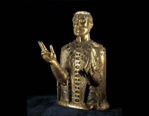 Bust Reliquary of St. Baudime, c. 1180-1200; Romanesque (French, Auvergne); gilded bronze, gems and enamel with a wood core; Parish Church of Saint-Nectaire, Puy-le-Dôme. This nearly life-sized bust is one of the earliest surviving objects of its kind and travels outside of France for the first time. The stippling of the beard, the rhythmic curls of hair and the elegant patterning of the saint’s vestments conjure a human presence even as its gold surfaces assert the holy nature of the effigy.