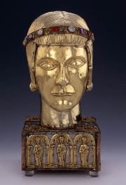Head Reliquary of St. Eustace, c. 1200, Romanesque (Swiss, Upper Rheinish, Basel), silver and silver gilt on a wooden core; British Museum. The shape of this reliquary, containing fragments of the skull of the Roman military leader Saint Eustace along with other relics, was intended to bring worshippers face to face with the heavenly visage of the venerated man.