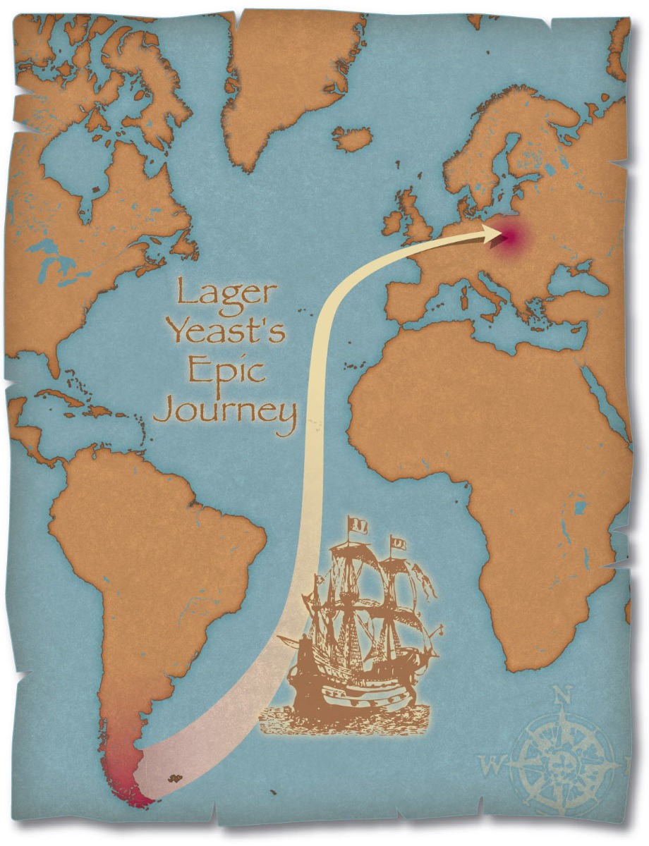 This illustration depicts the journey of lager yeast from Patagonia at the southern tip of South America to Europe 500 years ago. Illustration by: Barry Carlsen, UW–Madison