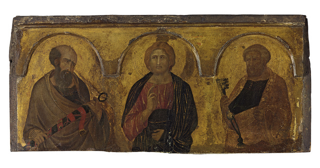 Painted around 1320 it depicts Christ with Saint Paul to his right clutching a sword wrapped with a bright red belt, and Saint Peter to his left clenching a prominent set of keys. The panel is painted in tempera, with gold leaf covering a background of three arches and fine gilding used to decorate Christ’s robes. The panel is thought to have originally been part of one of Lorenzetti’s most important altarpieces. Christ between Saints Paul and Peter provides a rare example of the artist’s work, famous for its naturalism and subtlety.
