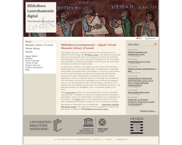 The unique holdings of the medieval monastic library of Lorsch, currently scattered over 68 libraries worldwide, are being re-compiled into a virtual library. Heidelberg University Library and local government officials in Germany have been working since March of 2010 to publish the 330 surviving Lorsch manuscripts and manuscript fragments online. The project by the name of “Bibliotheca Laureshamensis – digital” is being funded by the State of Hesse with 450.000 euros and will continue through 2013.