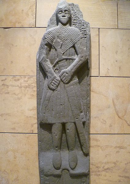 This form of armour is well represented on sculptured graveslabs in the Highlands and Islands, dating from the later fourteenth to the early sixteenth centuries. The chiefs, lairds and gentlemen (many of them vassals and kin to the Lords of the Isles) commemorated on these stones are usually portrayed with long swords with distinctive hilts. The pommels can be multi-lobate (a survival from swords of the Norse era), or wheel- or tear-drop-shaped. The cross guard often has a central tongue or langet, and the quillons usually slope towards the blade and end in spatulate terminals. Grips vary in length from single-handed to hand-and-a-half, and some might even be considered two-handed. The swords are usually in their scabbards and appear to be relatively broad bladed. The exceptional sword of John of the Isles was probably of the same type, but presumably richly decorated.