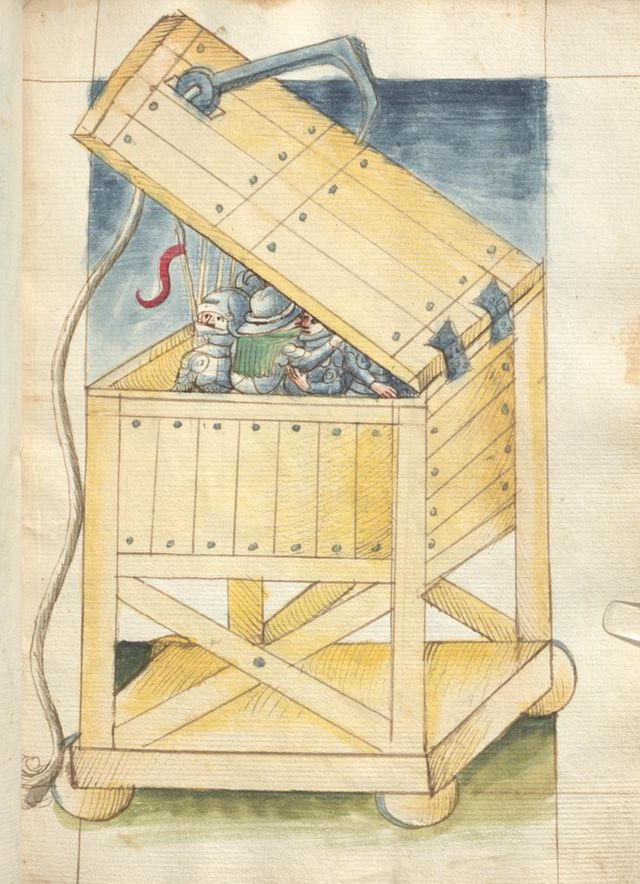 Whether it was to be used as a manual in military conflicts or simply to entertain its peaceful reader with its technical, literary and magical material, is still a matter of debate. In any case, it describes and depicts a number of martial instruments, ladders for the siege of castles, machinery to help horses cross a river, catapults, rockets, arrows, arbalests, nails, scissors, clasps and horseshoes, and recipes for preparing various kinds of fires. The reader is also shown some – at least in the context of engineering – unexpected pictures that seem to be somewhat less related to military affairs: a female chastity device, a tool for castrating men, the black queen of Sheba, a goose fastened to an anchor, and a few pictures on how to prepare a bath appropriately. Some of the machineries bear fantastic features; among them a huge wheeled cat with a long destructive pike in its mouth that might have served to frighten the enemy.