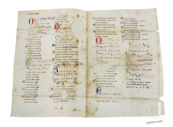 The major significance of Vindel’s discovery, in addition to bringing to light a unique manuscript witness, perhaps contemporary with the composition of the songs it contains, was that it offered the first known example of musical notation for any of the poems in the large corpus of medieval secular Galician-Portuguese lyrics. The leaf contains seven songs written in the voice of a young woman awaiting her absent lover by the Ría de Vigo, part of a poetic genre known as cantigas d’amigo, with monophonic musical notation for six of them. The manuscript attributes the songs to a male poet named Martin Codax, ostensibly a Galician minstrel from the second half of the 13th century.