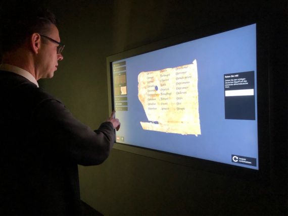 Smartphones and touchscreens could turn museum visits into a digital and multimedia experience. In the months ahead, an example of this can be seen in Admont Abbey in Austria. In a special exhibition, the abbey is presenting fragments of the ‘Admonter Abrogans’, a Latin-German dictionary from the period of around 800. The cultural treasures have been made accessible through a multi-media presentation, which researchers of the Institute of Creative\Media/Technologies at St. Pölten University of Applied Sciences (Austria) has designed. Photo credit: St. Pölten University of Applied Sciences/Kerstin Blumenstein