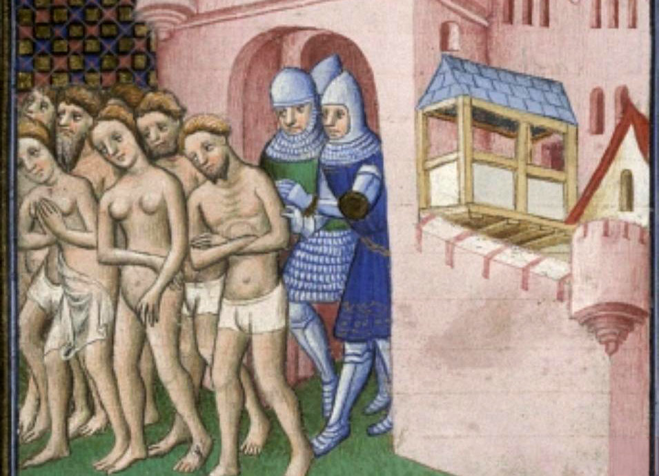 Top Image: Expulsion of the inhabitants from Carcassonne in 1209. British Library MS Cotton Nero E II Pt2, f. 20v