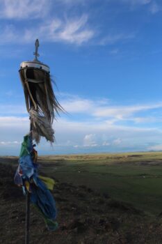 A horse-hair banner adorns a hillside monument in central Bayankhongor province, Mongolia. Photo by William Taylor