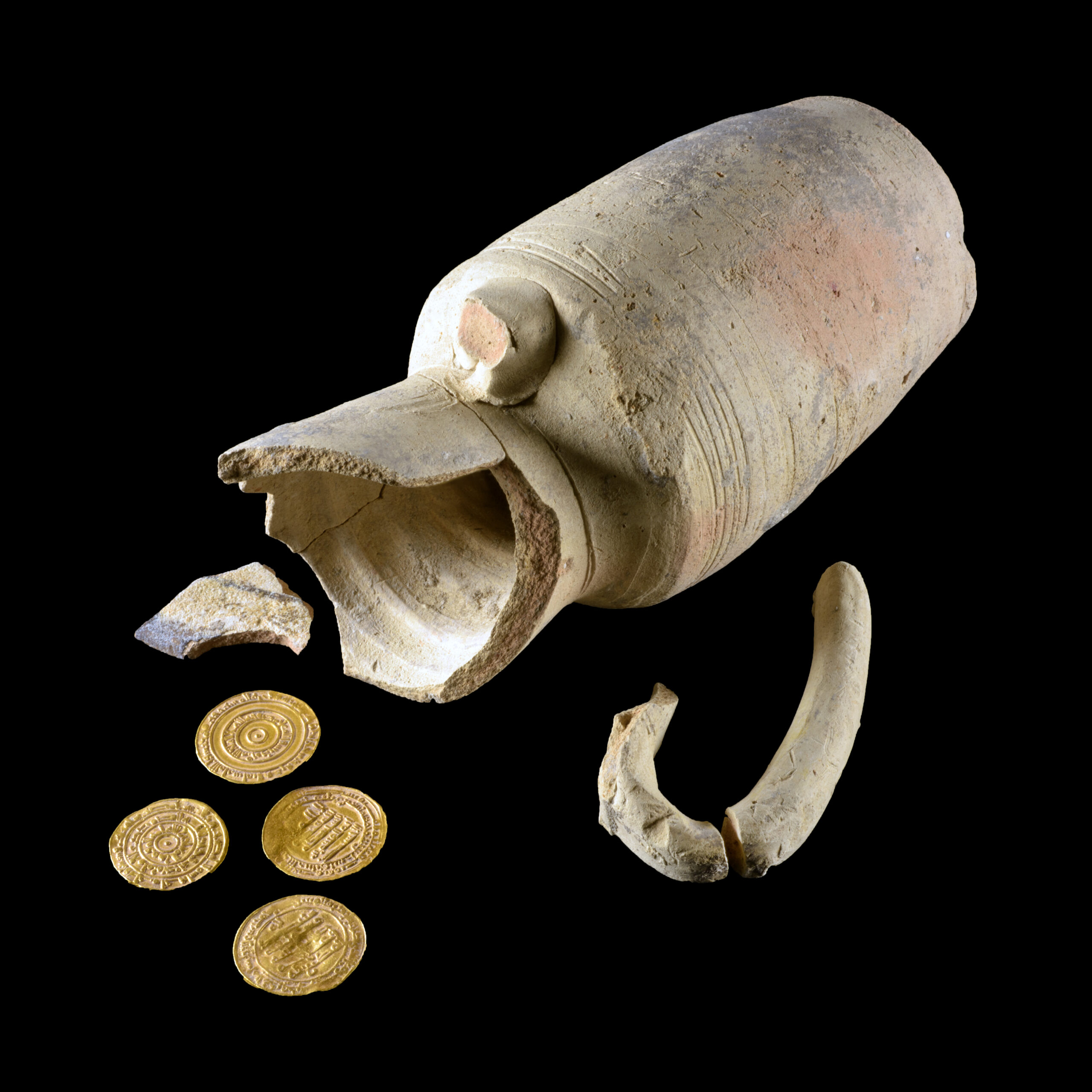 Top Image: The jug and the gold coins. Photo: Dafna Gazit, Israel Antiquities Authority