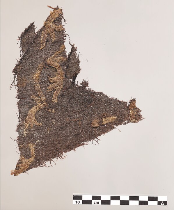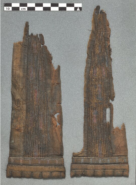 Fragments found near the ankle confirm he was wearing long trousers ending in padded cuffs decorated with exquisite tablet-woven bands. This sort of decoration adds new information to the design of Viking Age trousers.