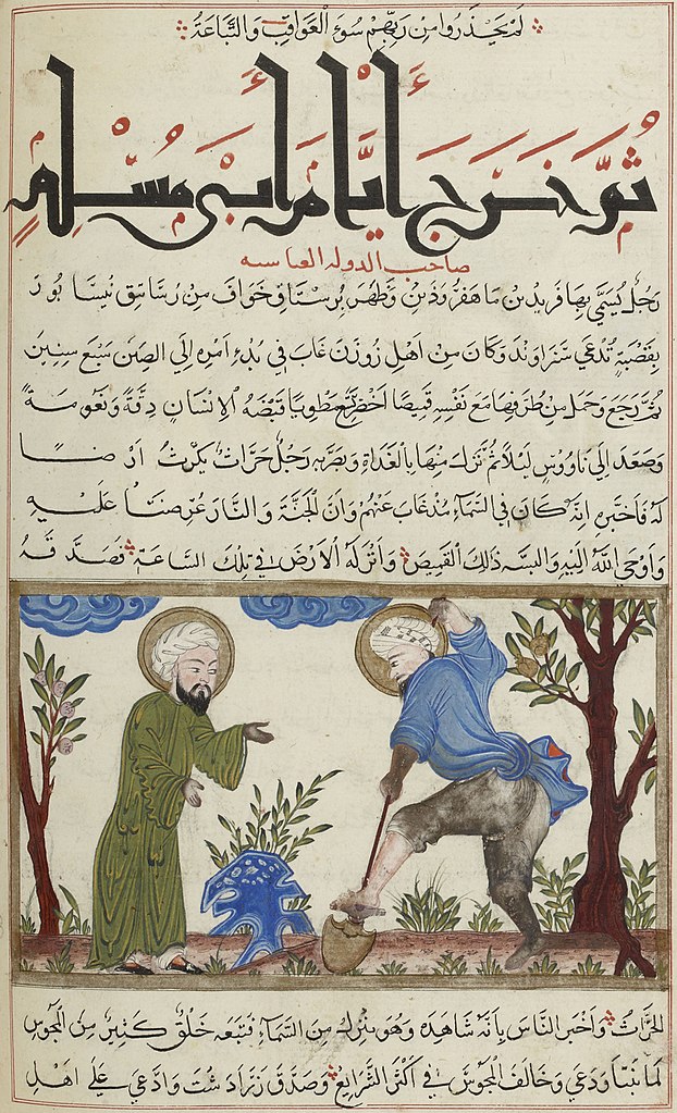 Bihafaridh ibn Mahfarvardin was a Zoroastrian from the area of Nishapur. He was a trader and it is reported that he spent seven years in China. After his return he started to preach. One account states that he went up to a sepulchral monument where he spent the night. In the morning he descended wearing a green silk shirt and he told a peasant working in a nearby field that he had ascended to heaven, seen paradise and hell and had spoken with God, who gave him the shirt (the sources allege he brought it back from China). In a different account Bihafaridh feigned his death from an illness. Prior to that he had a sepulchral monument built upon which his body was laid (in other accounts it’s a tower or a mountain where his body is placed). This source by al-Tha‘labi claims that he survived upon the monument on rainwater and a stash of preserved food for a year. He then descended in the green silk shirt and made similar claims as in the first account. This idea of going on a heavenly journey was very popular in the Mediterranean and the Middle East of Late Antiquity and the early Middle Ages among Christians, Jews, Muslims, Zoroastrians, and Manichaeans. The green silk shirt, the clothing of the inhabitants of paradise, was the proof of the veracity of this journey.