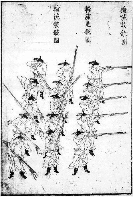 Europe, too, had ancient precursors to the volley-fire method – the Dutchmen who pioneered the countermarch technique for muskets in the late 1500s drew their inspiration from Roman military manuals. But the difference is that in China the ancient techniques never died out. China – in contrast to Western Europe – saw large standing armies throughout its history, so organized collective drill and discipline remained standard operating procedure in its armed forces. In any case, the first clear evidence for China’s use of the countermarch technique with firearms appears in the late fourteenth century. In the years that followed, as Chinese guns evolved, the countermarch technique continued to be used.