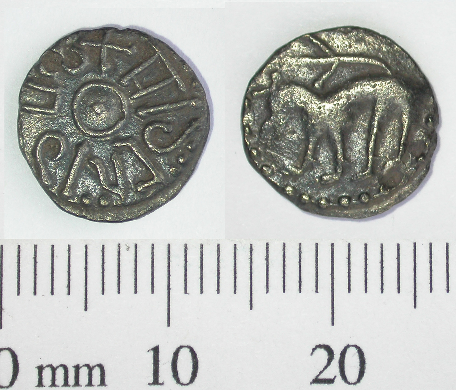Early medieval coin; silver sceat of King Aldfrith of Northumbria 685-704, presumably struck at York. Photo: The Portable Antiquities Scheme / The Trustees of the British Museum