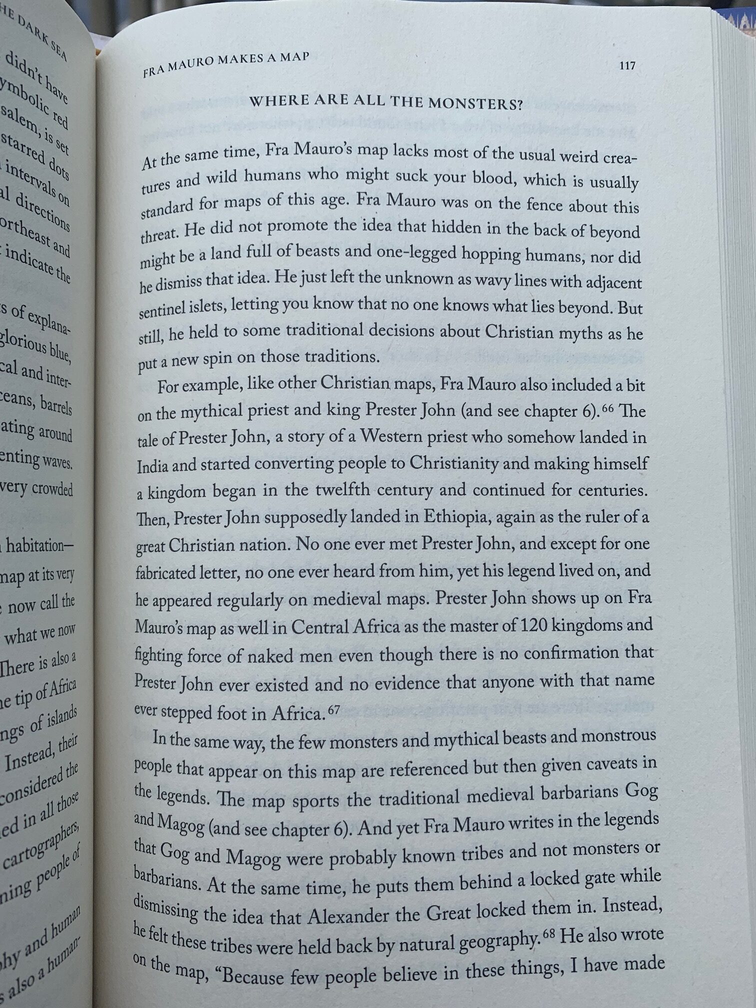 At its core, this map has two captivating levels: the geography, and the inscriptions. The geography is spectacular for its time and underscores various decisions that Fra Mauro made during its construction. For example, the fact that he eschewed much of Ptolemy, which broke away from the standard map of the Middle Ages, made him a cartographic revolutionary. And then there are the inscriptions. Since I had English translations by Piero Falchetta to rely on, it was fascinating to understand what was important, or not, to Fra Mauro as he made this map because he explained every decision in the texts. And it was during my reading of those texts that I came across the perfect title for this book – Qui comenza el mar scuro – which translated from Venziano is “Here begins the dark sea.”