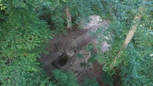 Drone image of the excavation trench sectioning rampart and ditch. Photo by R. Kunze / State Office for Heritage Management and Archaeology Saxony-Anhalt