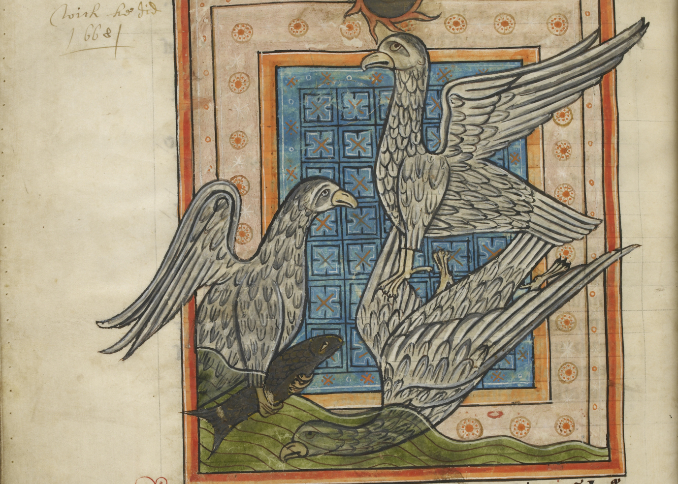 Three large birds of prey in a 13th-century manuscript – British Library MS Harley 4751 fol. 35v