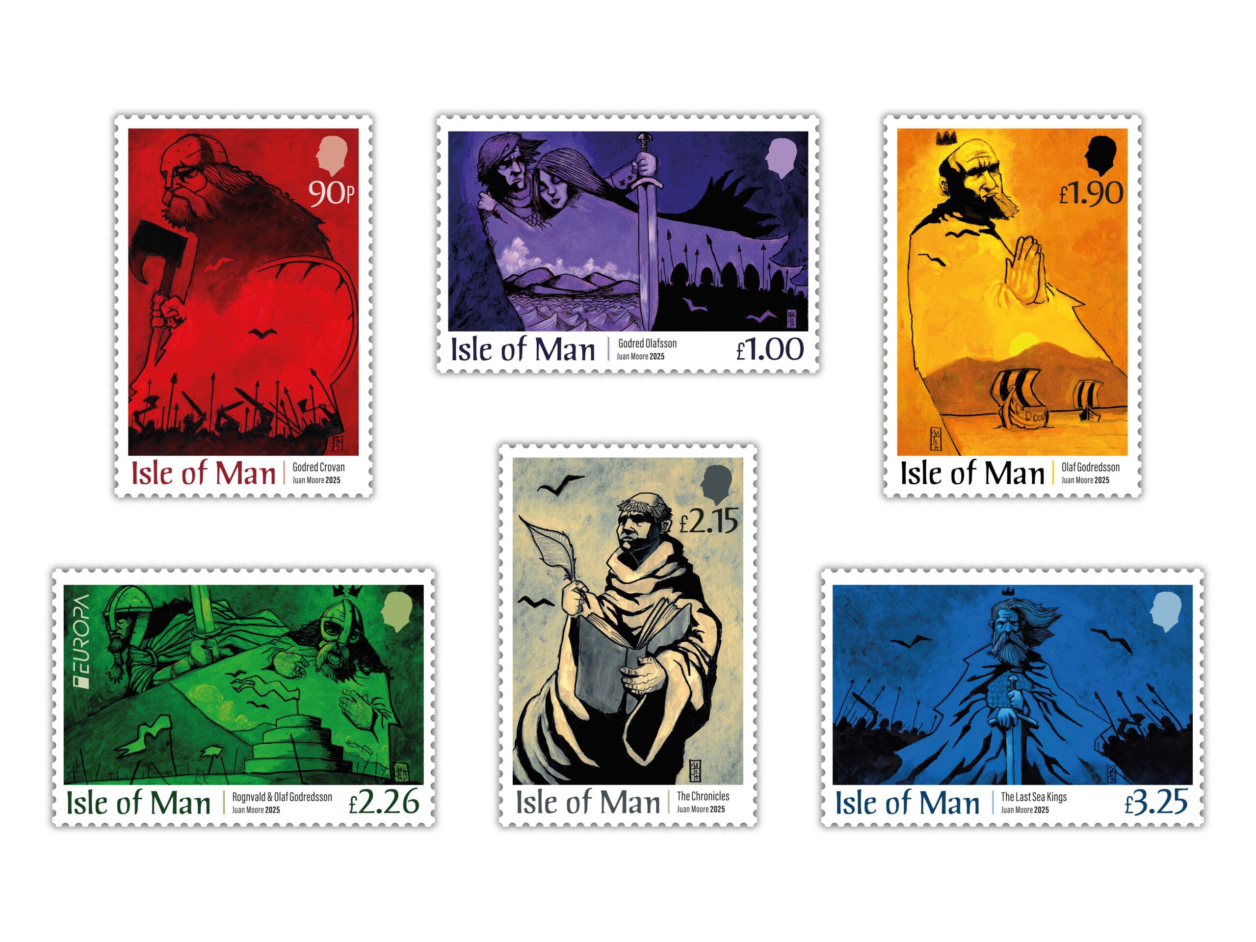 Professor R. Andrew McDonald commented: “Promoting Medieval Manx history is something I’m very passionate about, and I am honoured, especially as someone from outside the Isle of Man (I’m Canadian!), to have been asked to collaborate on this exciting stamp issue. It has been inspiring to see Juan Moore’s evocative artwork bring the period to life.”