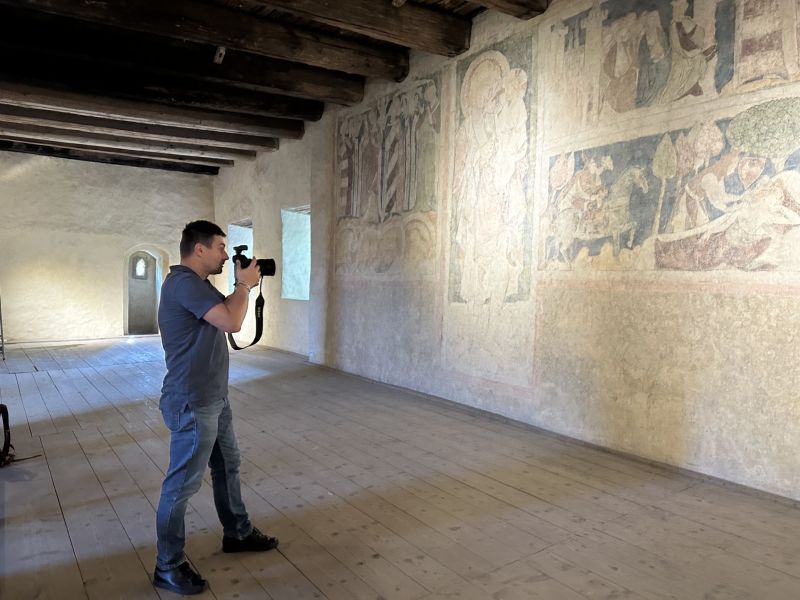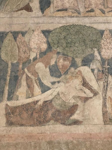 Its greatest treasures, however, are within. On the second floor, the great hall preserves a cycle of polychrome paintings from 1320–1330, created by artists from the Swiss-German border region. The central panel shows St Christopher carrying Christ across the water — an image of courage and loyalty that resonated strongly with medieval knights. Even more remarkable are the adjacent panels: the world’s only medieval wall paintings still in their original place that depict episodes from the legend of Sir Lancelot.