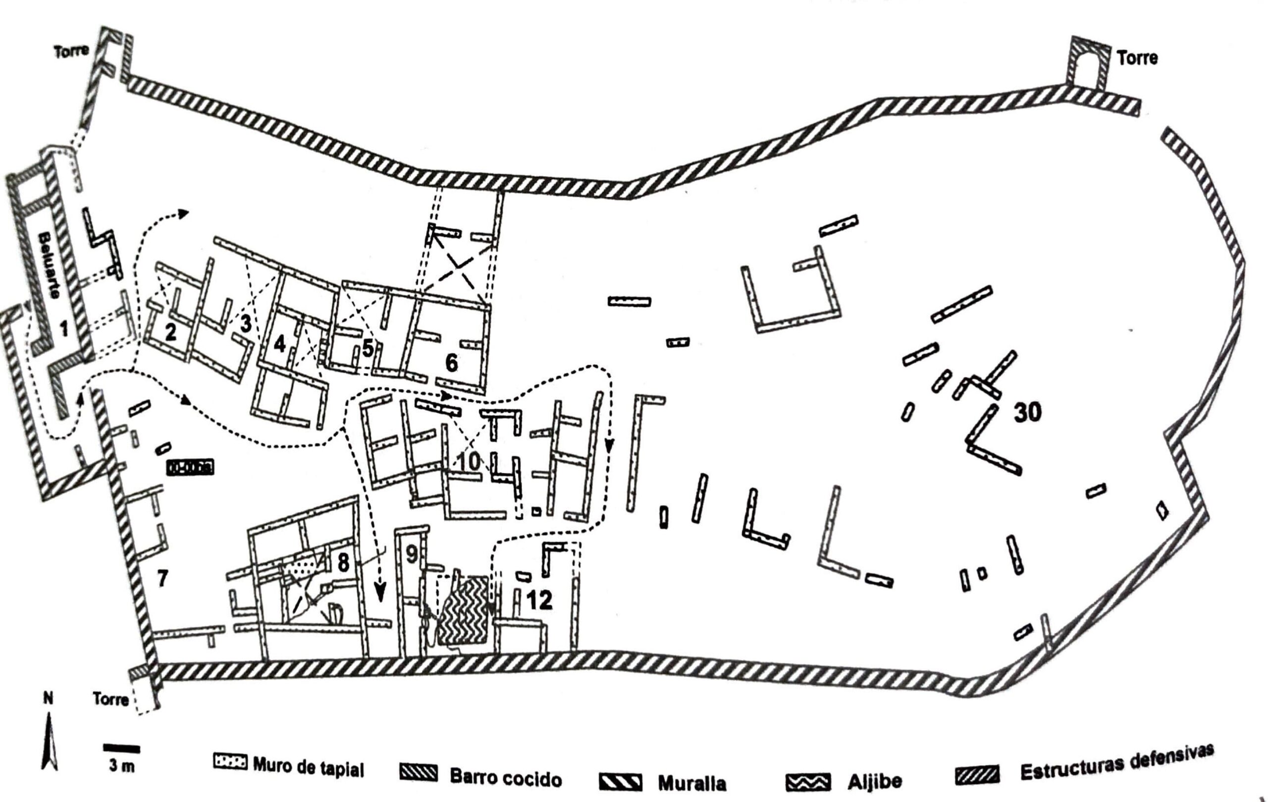 One of the very few extensively excavated examples of a fortified rural settlement is Torre Bofilla in Bétera, within the Valencia region, which was occupied from the 11th to the 14th century, first as an undefended hamlet, and later, with added fortifications (Fig. 4). The Torre Bofilla defences (see red outline on Map 1) contains a central defensive tower and was enclosed with a wall system.