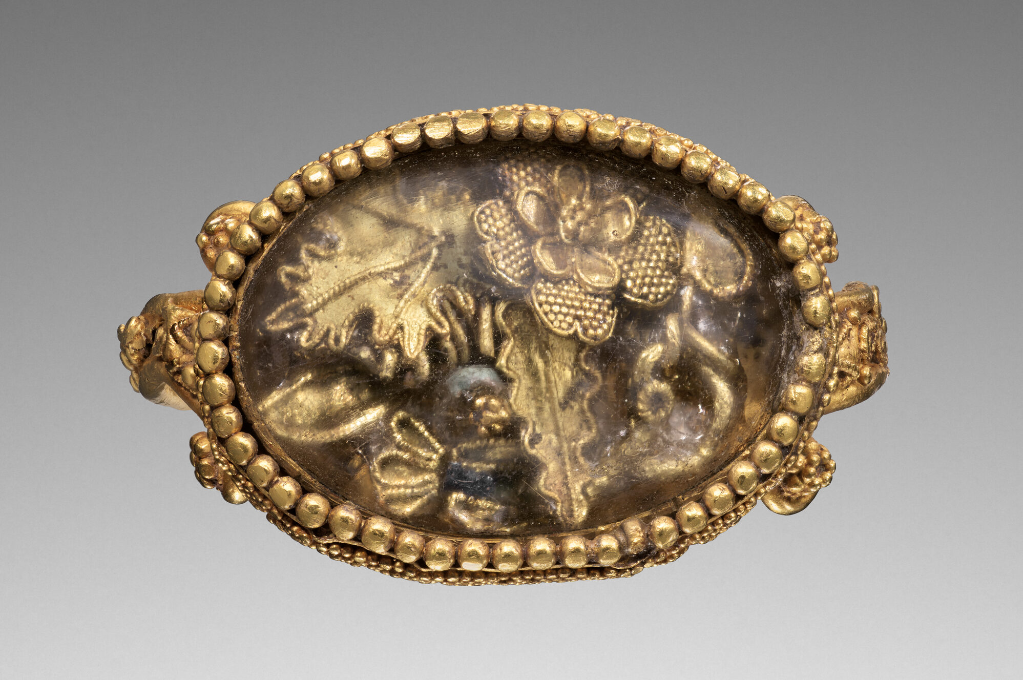 Box-Bezel Ring with Internal “Garden” Scene Greek, about 150 BCE Ring: gold, garnet; cabochon: rock crystal, gold, enamel, glass 2.9 × 2.1 cm (1 1/8 × 13/16 in.) Getty Museum 2025.71