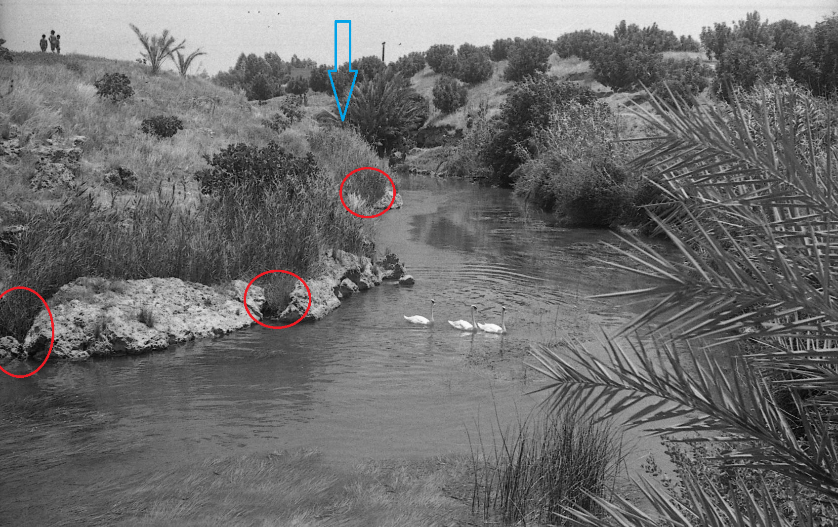 Top Image: The northern bank of Nahal ‘Amal on the late 1960’s, looking east. Assumed inlets are indicated by red circles, diverting water into the tunnels system; the eastern mill is hidden by the hill, downstream of the tunnels (blue arrow). The hill was partly removed by construction works on 2017, revealing the inner parts of the tunnels. Photo by Azarya Alon