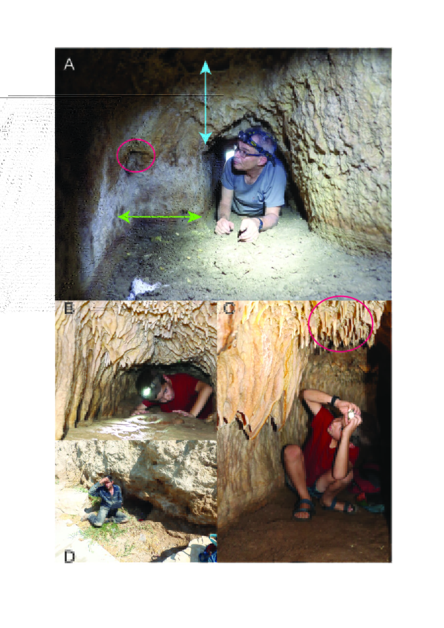 A Tunnel C. General view of meeting point between quarrying teams, looking west. Oil-lamp niche marked with red circle, horizontal deviation with green arrow, and vertical deviation with blue arrow (photo: Azriel Yechezkel); B Tunnel C, looking east toward the T junction (photo: Azriel Yechezkel). C Tunnel C, speleothems on tunnel roof. Location where stalactite samples were extracted shown with red circle (photo: Azriel Yechezkel). D: Entrance to Tunnel D (photo: Amos Frumkin)