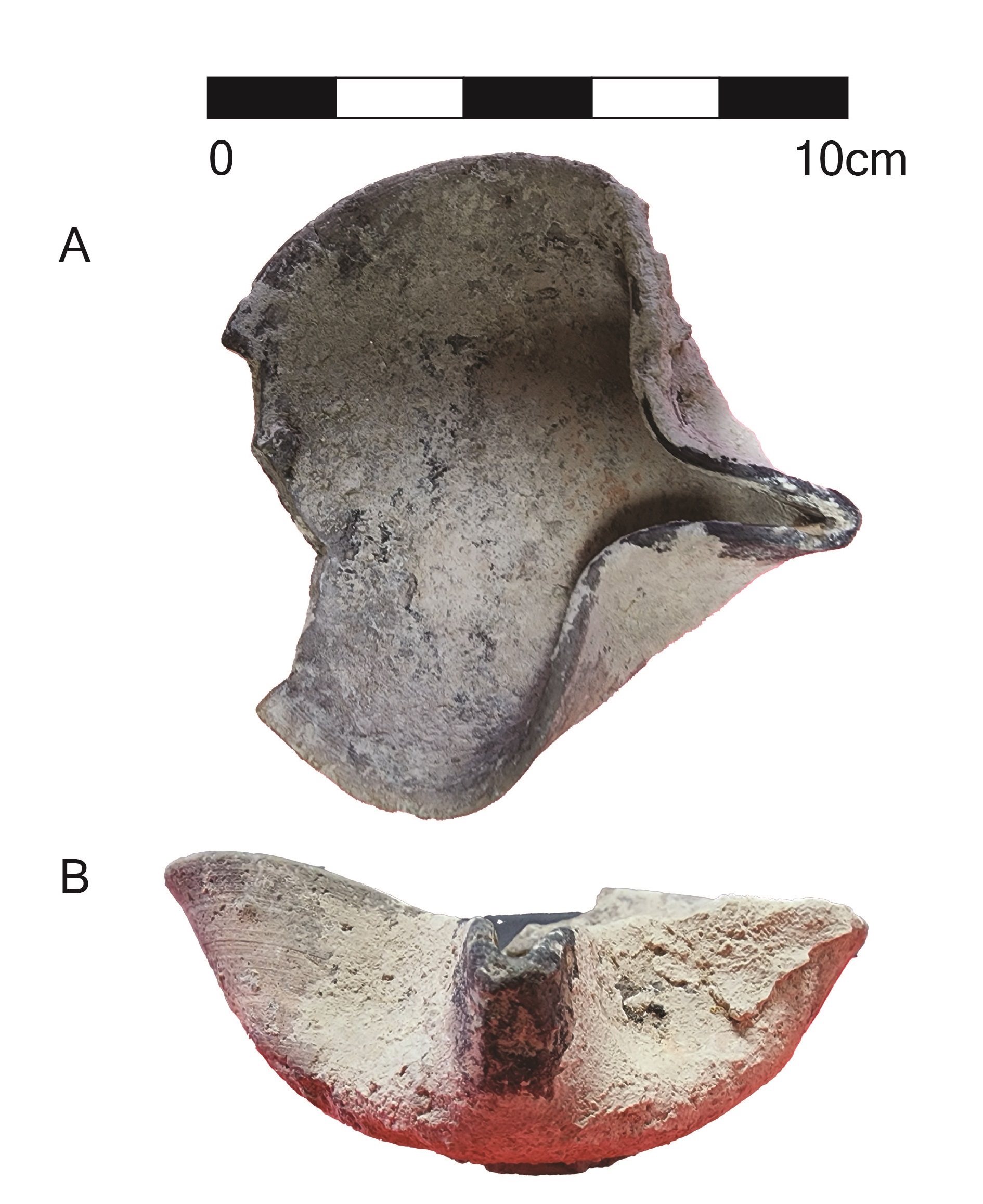 A late Mamluk lamp (used until the sixteenth century CE) found at the eastern mill (Fig. 11), downstream of the tunnels (mill 2 in Fig. 2). A—top view; B—front view.
