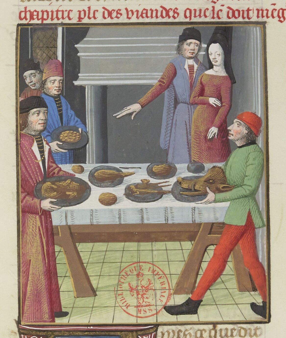 In medieval England, the boar’s head was brought to the table with great ceremony: preceded by trumpeters and attendants, it was borne aloft on a gilded platter, richly decorated with bays and rosemary. This tradition is documented in numerous royal and collegiate records. For example, at the coronation of Henry II’s son in 1170, the king himself is recorded as carrying the boar’s head into the hall with trumpets sounding. Queen’s College, Oxford, founded in 1340, has preserved this custom to the present day, marked by an elaborate procession and carol singing.