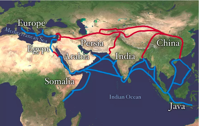 The red lines indicate major overland trade routes (silk roads). The blue lines indicate the sea route more commonly taken after Vasco de Gama’s fleet landed in Calicut in 1498. The overland route was considered to have extended to the Indonesian archipelago, but new research indicates it stretched to the waters to the north of Australia. Image: Wikipedia