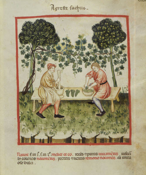 The text then turns to food, discussing the health benefits of dozens of common items, including apples, mushrooms, spinach, and wheat. Each entry is brief, usually just a few lines, but enough to outline the effects a food was believed to have on the body. Grapes, for instance, are praised for “nourishing and fattening the body while keeping the bowels free,” while peaches “relieve burning fevers because of their cold-moist nature, and they lubricate the stomach.”