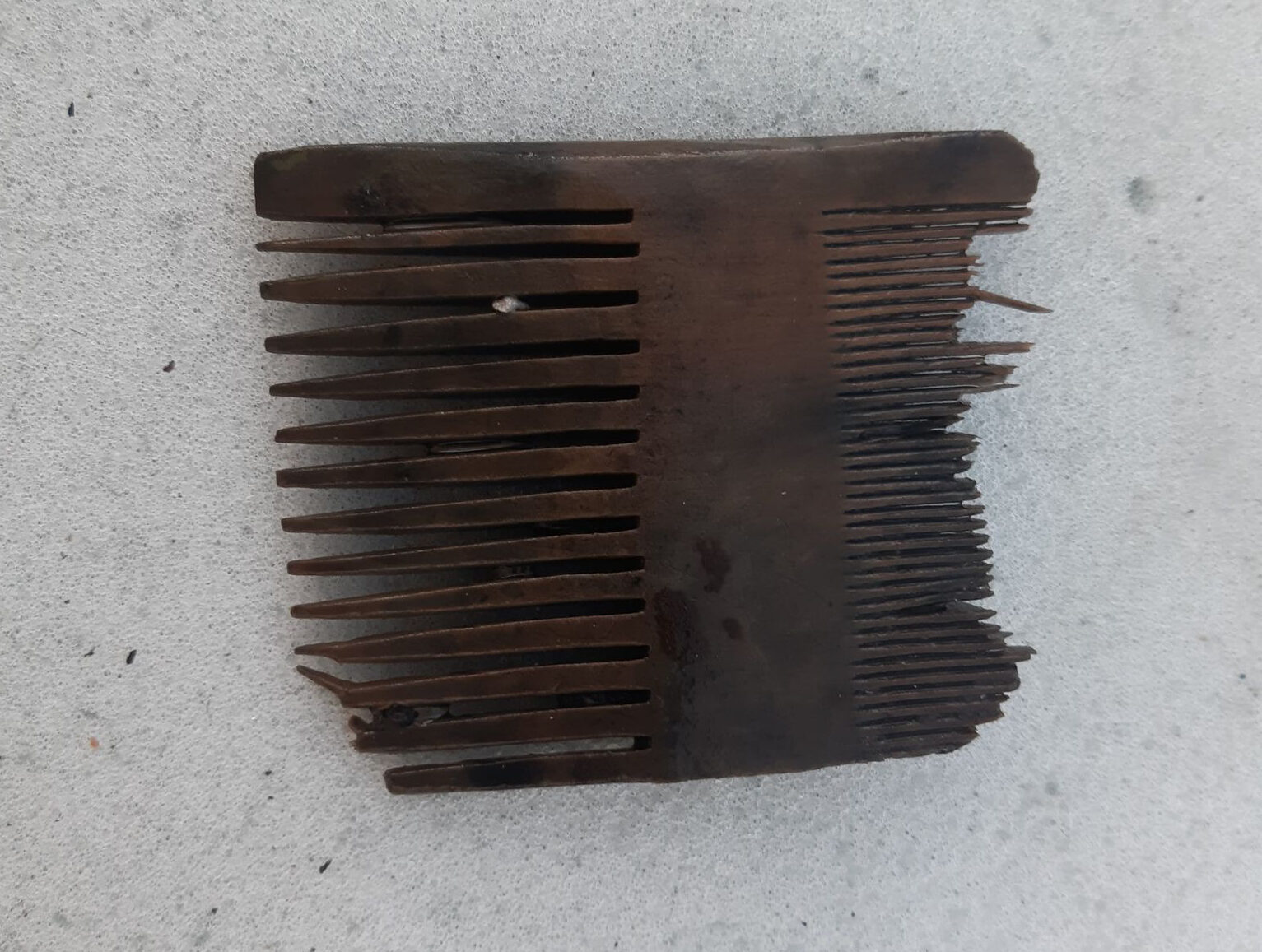 One of two combs that were found in the shipwreck. Both are made of wood and feature fine teeth on one side and larger teeth on the other. Combs were common tools in the Middle Ages and were used both for hair care and for keeping hair free of lice. Photo courtesy Viking Ship Museum