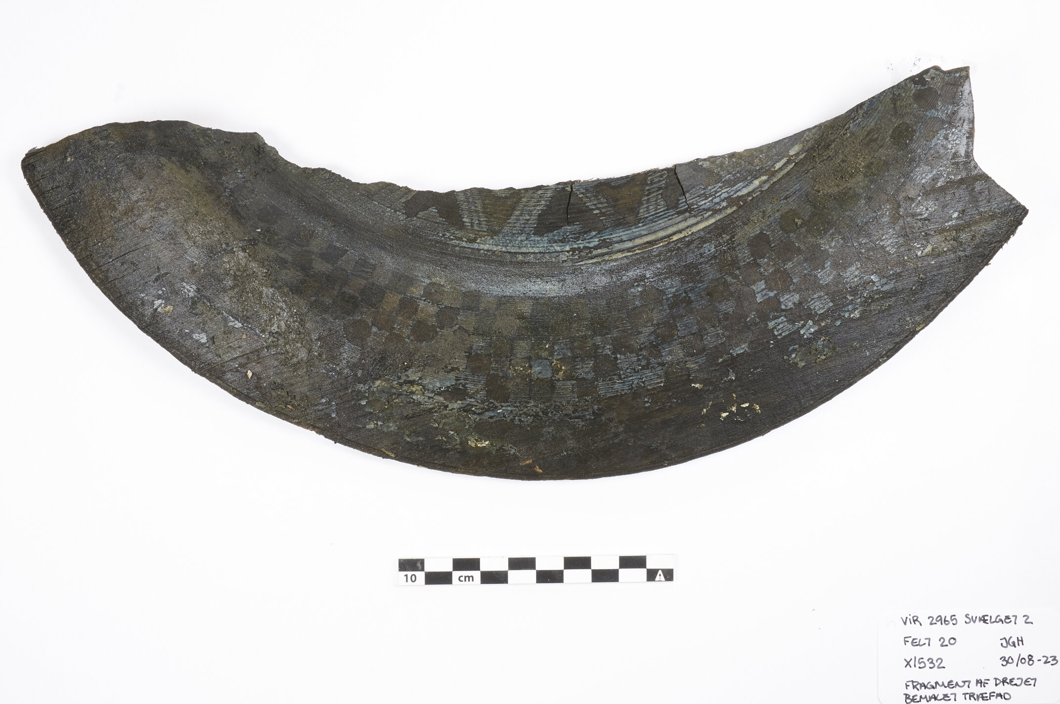 Fragment of a turned wooden dish, approximately 25% preserved. Original diameter about 40 cm, height about 3 cm, thickness about 5 mm. The decoration consists of incised contours with applied color: radial triangular lines on the center, a checkerboard pattern (approx. 7×7 mm) on the rim, and a narrow band with intersecting zigzag lines. The paint now appears black-gray with traces of lighter colors. The dish shows no signs of use. Photo courtesy Viking Ship Museum