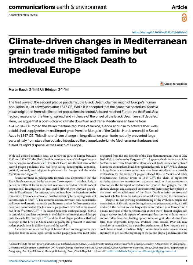 The article, “Climate-driven changes in Mediterranean grain trade mitigated famine but introduced the Black Death to medieval Europe, by Martin Bauch and Ulf Büntgen, is published in Communications Earth & Environment.Click here to read it.