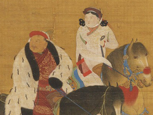 Figure 1: Qubilai Qa’an Hunting, ca. 1280. In this famous painting by the Yuan court artist Liu Guandao 劉貫道, Qubilai (r.1260−1294) is seen with one of his empresses, presumed to be his chief wife Chabi (d.1284)