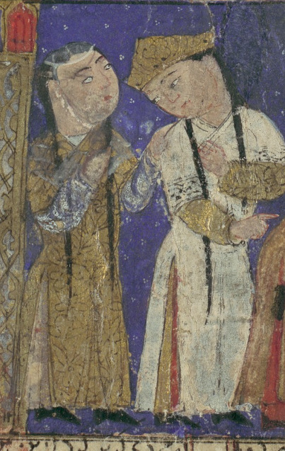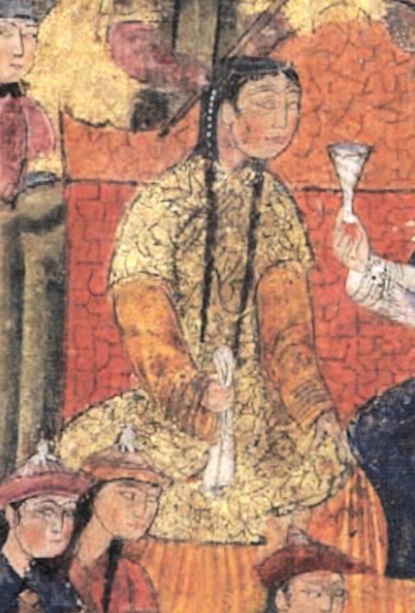 Figure 5: Depiction of an Ilkhanid queen from the frontispiece of the Mūnis al-āhrar fī daqā’īq al-āsh’ār, 1341. Produced in Isfahan in the final days of Ilkhanate, the identity of the royal couple is of great debate. It is often suggested (though not confirmed) to depict Suleiman Khan (r.1339−1341) and his wife, Sati Beg, a daughter of the Ilkhan Öljeitü (r.1304−1316). Mu’nis al-ahrar Frontipiece, 1341 – The Free Man’s Companion to the Niceties of Poems – WikipediaFigure 6: “Rudaba and Zal together,” from the First Small Mongol Shāhnāme, ca. 1300, Ilkhanate. Chester Peatty Library, Per. 104.005Figure 7: “Sudaba makes accusations against Siyavush,” from the First Small Mongol Shāhnāme, ca. 1300, Ilkhanate. Freer Gallery of Art, F1930.90Figure 8: “Caesar Gives his Daughter Katayun to Gushtasp,” from a Shāhnāme. Ilkhanate, ca.1330−40. MET 1974.290.22 Abu’l Qasim Firdausi – “Caesar Gives his Daughter Katayun to Gushtasp”, Folio from a Shahnama (Book of Kings) of Firdausi – The Metropolitan Museum of ArtFigure 9: “Farrukhruz weeping at the Sight of Gulru,” from Kitāb-i Samak ‘Ayār, part 3. Ilkhanate, ca. 1330s. Bodleian, MS.Ouseley 381.f.013b