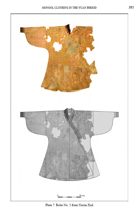 Figure 18: Woman’s undercoat. Robe no. 4 from Nartiin Khad burial, Dornogovi aimag, Mongolia. Image from Ildikó Oka, “Mongol Clothing in the Yuan Period.” Acta Orientalia Academiae Scientiarum Hungaricae 68 no.4 (2015): 393