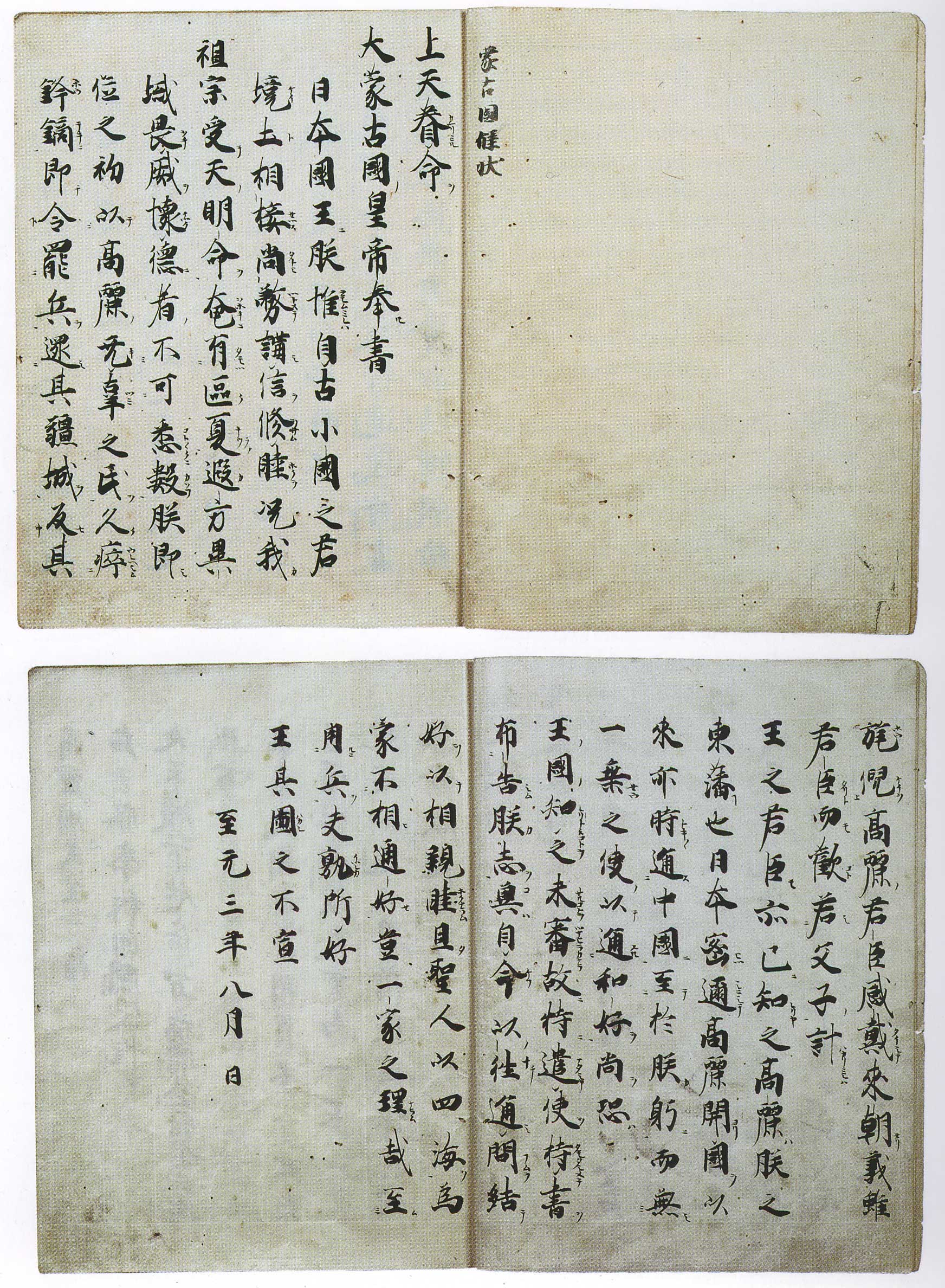A Chinese letter written in 1266, addressed to the “King of Japan” (日本國王) on behalf of Kublai Khan, prior to the Mongol invasions of Japan. Annotations explaining points of grammar have been added to the text, intended to aid Japanese-speaking readers.