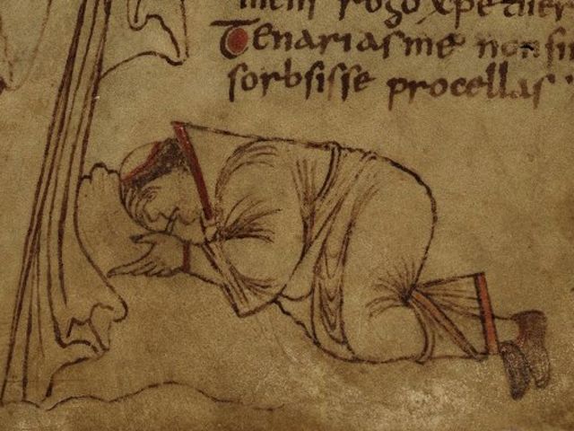 St. Dunstan (909-988) served as the Abbot of Glastonbury and later as Archbishop of Canterbury, and Hall stresses that few “artists” in history were ever as politically powerful or socially elevated as he was. While he was at Glastonbury, he produced a Latin grammar book, and on the frontispiece he drew a giant figure of Christ. Dunstan then placed a much smaller portrait of himself beside Christ, making it both a personal statement and a devotional act, and he added a short prayer: “I ask, merciful Christ, that you may protect me, Dunstan, and that you do not let the Taenerian storms drown me.” Hall notes that the “storms” are best read as worldly temptations and spiritual peril, and he also points out how Dunstan’s identity is underlined by the prominence of the inscription above him.