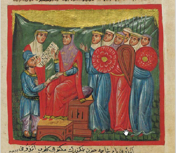 Miniature from the Romance of Alexander in which the Amazons are depicted receiving a letter from Alexander the Great. Istituto ellenico di studi bizantini e postbizantini , fol. 168r