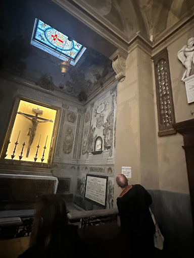 Inside, visitors encounter an interior shaped by both medieval architecture and later decoration. Marble flooring, reused columns, and a series of artworks contribute to the church’s visual impact. Some of the best-known pieces date to the early modern period, including works associated with Rome’s Baroque artistic culture. The church’s location—near the Ara Pacis and the Mausoleum of Augustus—also places it within one of the city’s most historically dense districts.