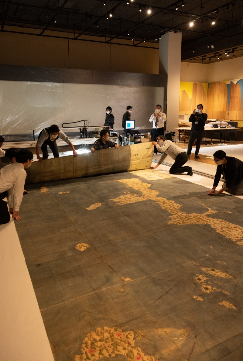 Researchers spread an old map of Ryukyu in an exhibition room at the National Museum of Japanese History in Sakura, Chiba Prefecture, before it is scanned. Photo courtesy of Satoru Kuroshima