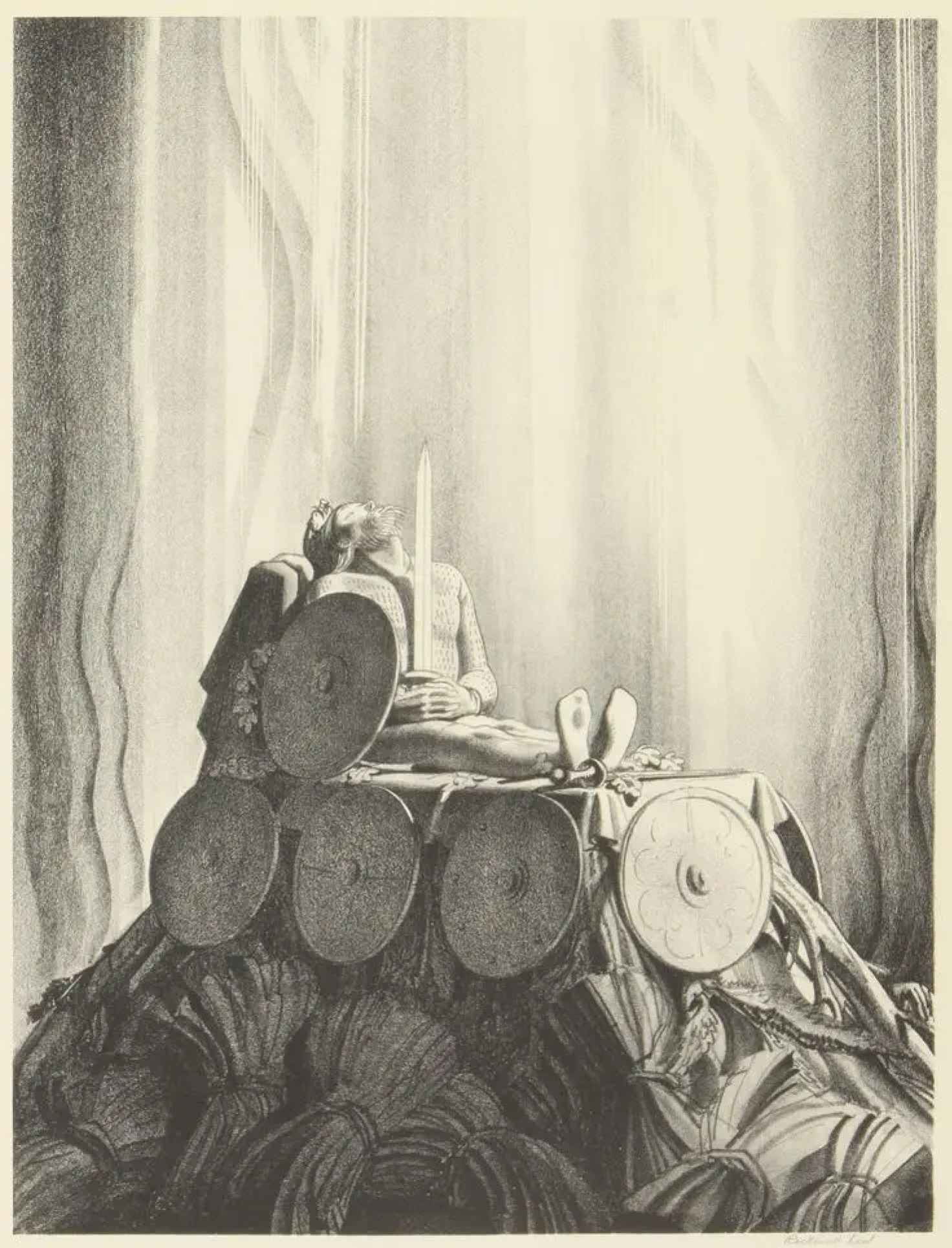 Lying on his funeral pyre, Beowulf’s death bodes ill for the Geats. Created by Rockwell Kent in 1931