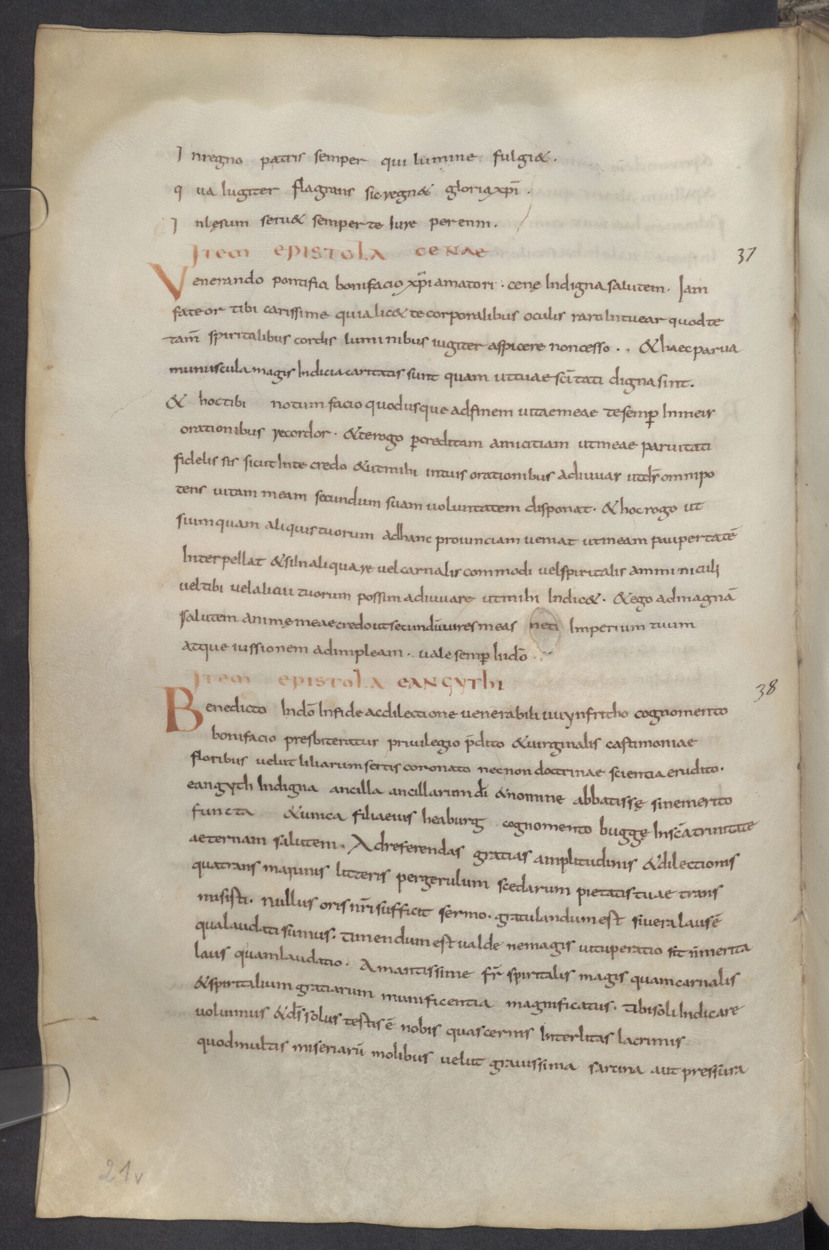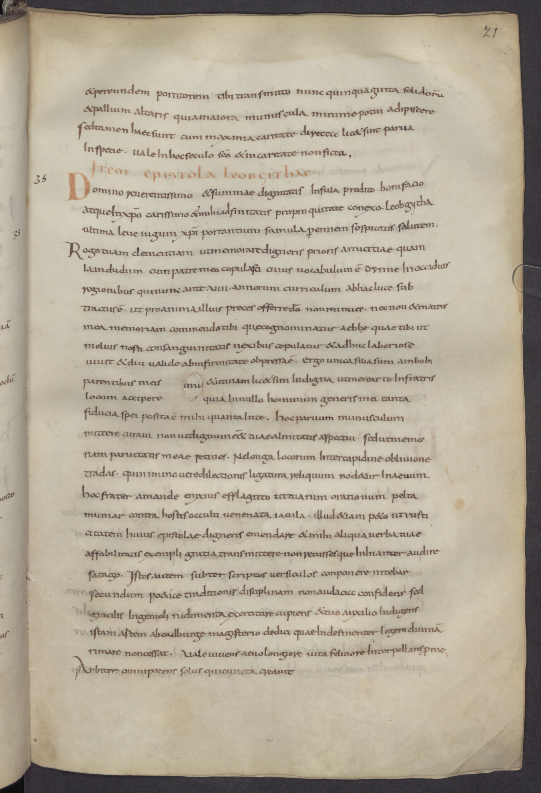 In her letter, Leoba addresses her beloved kinsman Boniface, asking for his prayers for her deceased father and her ailing mother. As an only child, she tells him she regards him as a brother, since there is no one else in whom she can place her trust. The letter reveals an intimate friendship sustained across the miles through correspondence, the exchange of gifts, and what Clare Lees and Gillian Overing have termed “communal literacy,” in which male and female monastics shared poetry, knowledge, and spiritual encouragement to their mutual benefit and growth.