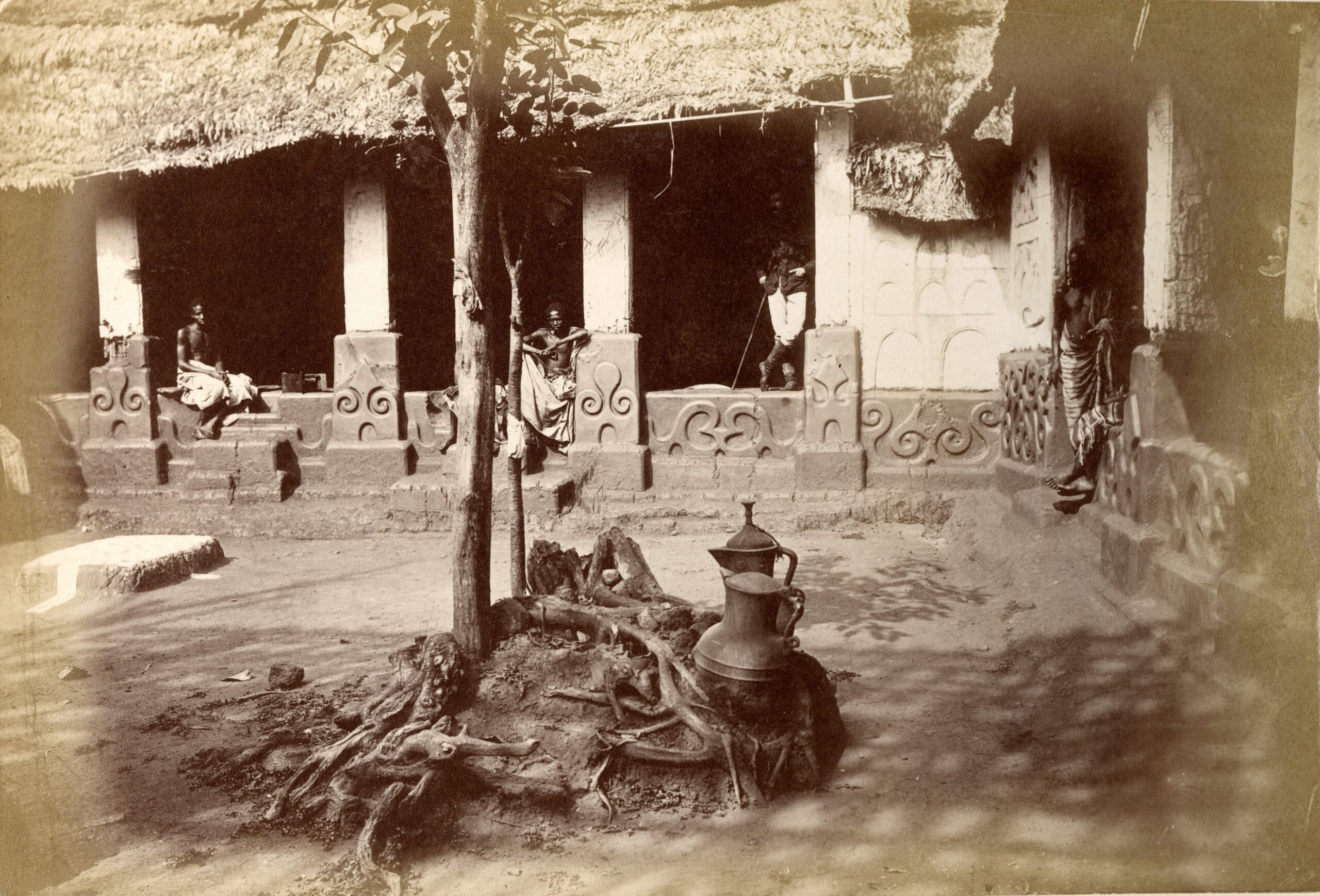 One of the key pieces of evidence featured in the exhibition is a photograph taken in 1884 showing the Asante Ewer alongside another medieval European jug in a courtyard of the royal palace of the Asantehene, the ruler of the Asante people, in Kumasi, in present-day Ghana. Their position in what appears to be a shrine at the centre of the courtyard suggests that these imported vessels had become highly valued items within Asante ritual life.